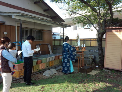 奥にある桜の木も残念ですが、今回の新築工事に影響がでるため倒す事になりその前に、キッチリとお祓いしていただきました。