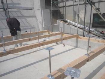 鋼製束と呼ばれる(角のようになっている銀色の物)を大引きにビスで止めていきます。