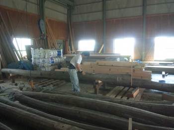 作業場では再利用する丸太梁と格闘中の若き棟梁の姿が・・・